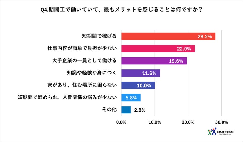 「短期間で稼げること」にメリットを感じる方が最も多く(28.2%)、次いで「仕事内容が簡単で負担が少ない(22.0%)」、「大手企業の一員として働ける(19.6%)」といった点が挙げられました。