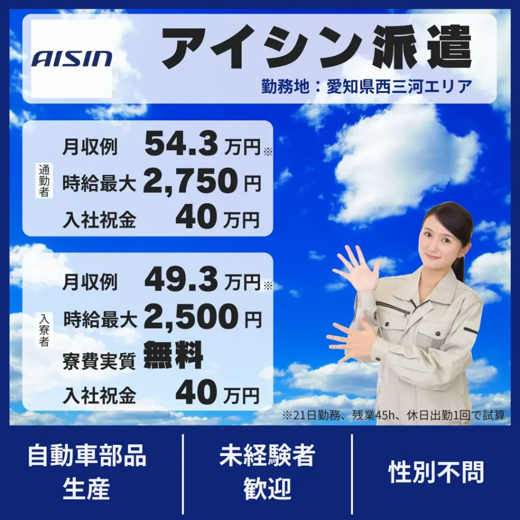 高待遇で月収例54.3万円(通勤者)としっかり稼げるのがアイシン派遣の魅力。