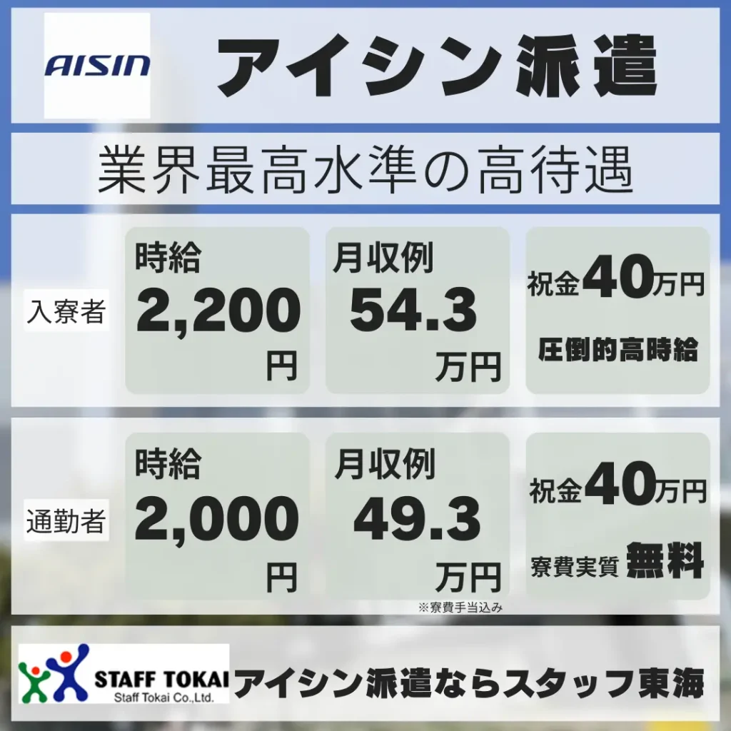 アイシン派遣は通勤者(時給2,200円)、入寮者(時給2,000円)で基本時給が異なります。