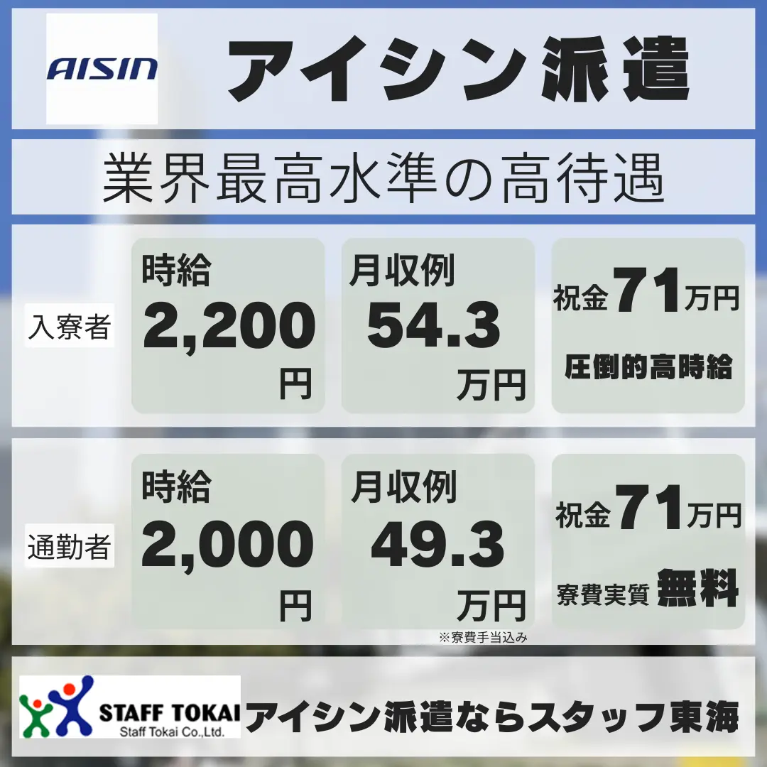 アイシン派遣は通勤者(時給2,200円)、入寮者(時給2,000円)で基本時給が異なります。