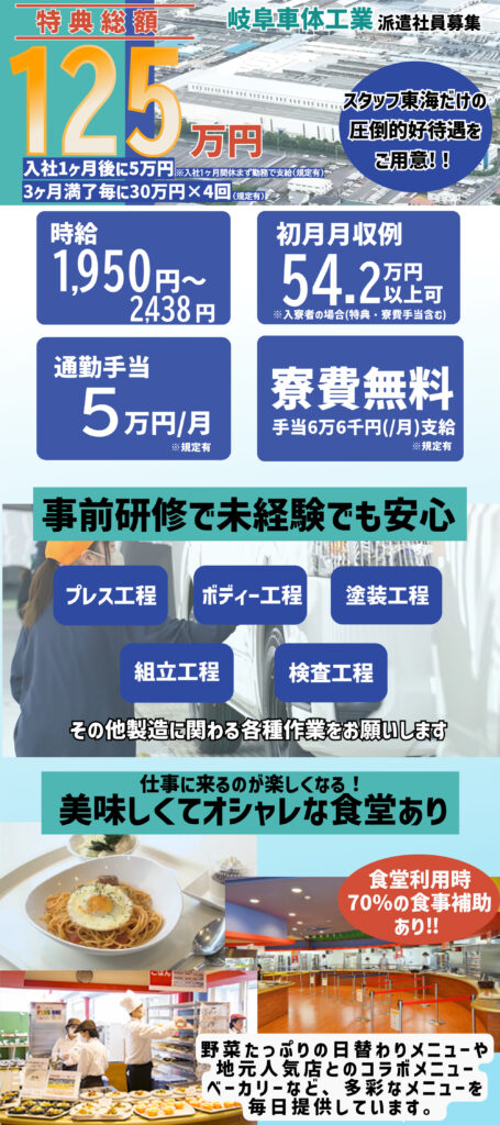 岐阜車体派遣の時給は1,950円と高時給で、手当類を含めた初月の月収例は54.2万円。