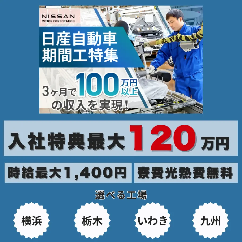 それぞれの日産の工場で期間工を募集しており、応募者が工場を自由に選べるのが特徴です。