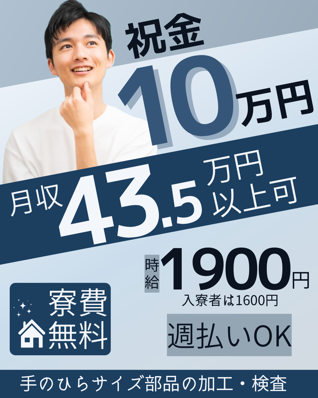 【祝金10万円】通勤:月収43.5万円以上可!時給1900円!/寮費無料/手のひらサイズ部品の加工&検査/40代男性活躍中!/未経験大歓迎!/愛知県豊田市 A藤岡