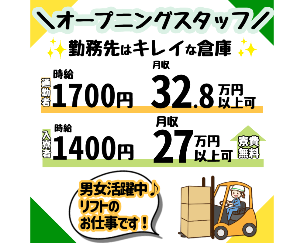 【通勤】時給1700円!月収32.8万円以上可!/【入寮】時給1400円!月収27万円以上可!寮費無料!/リフトスタッフ大募集!/勤務時間相談OK!/きれいな倉庫で快適!/55歳位迄の男女活躍中!/愛知県東海市【sigu大府】